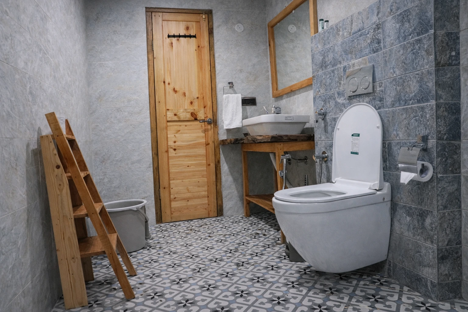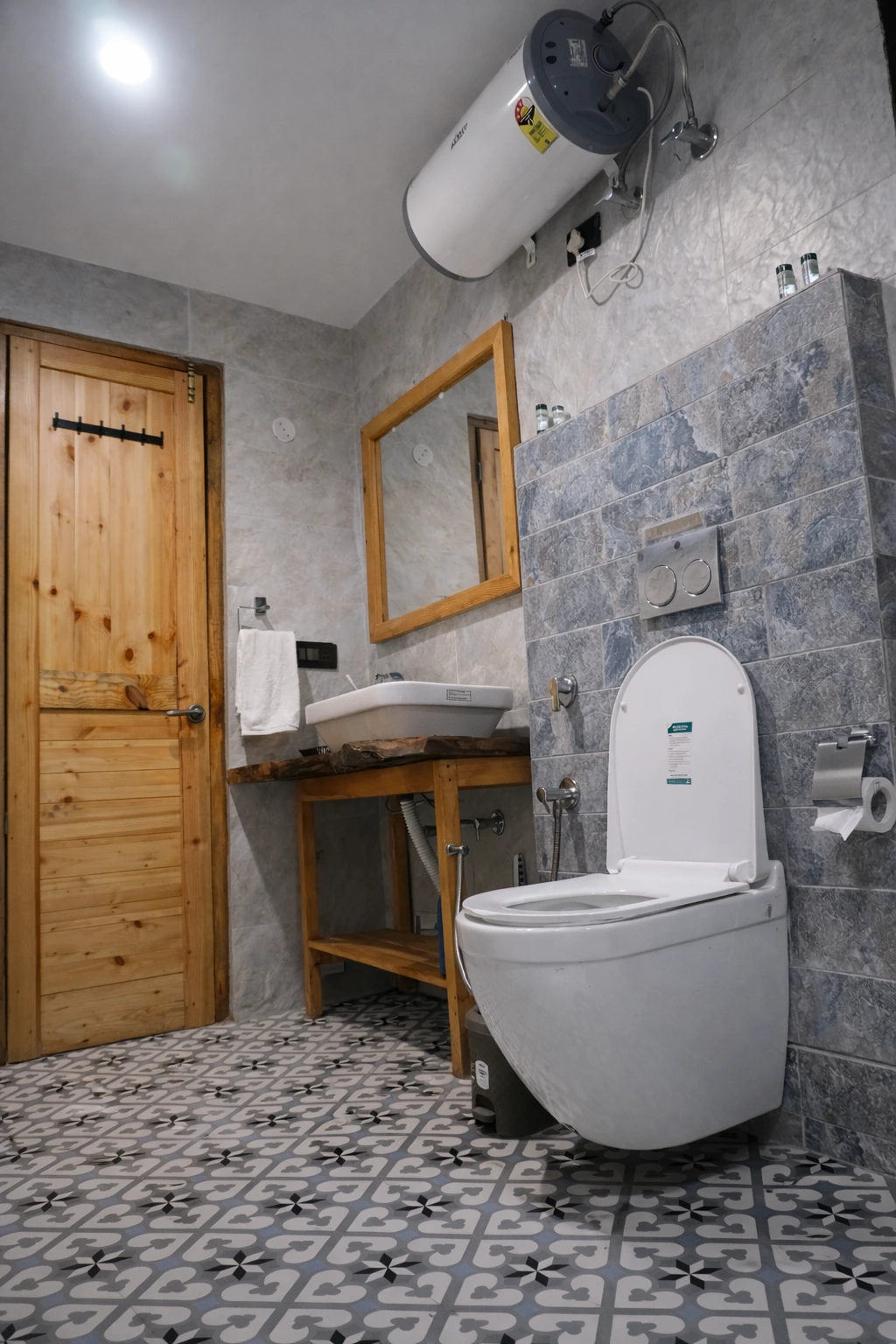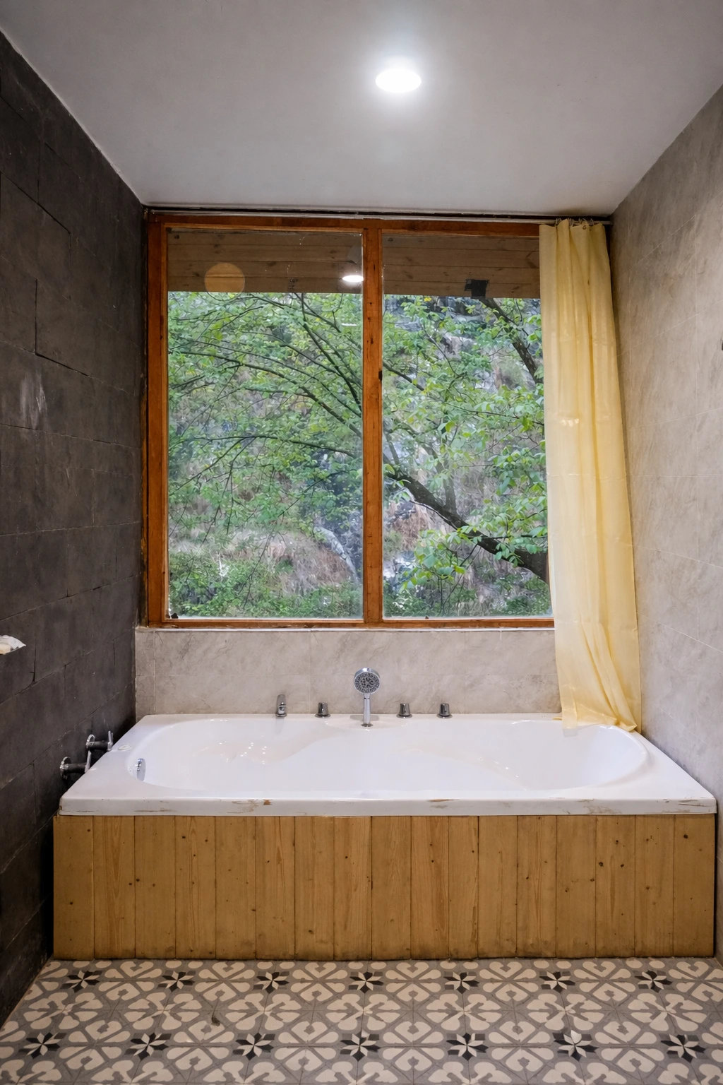 Indulge in a beautifully designed washroom at By The Brook in Tirthan Valley, featuring a relaxing bathtub, modern fittings, and premium toiletries.