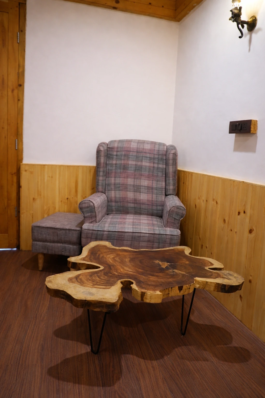 A warm and inviting sitting area at By The Brook in Tirthan Valley, perfect for relaxing, enjoying conversations, or simply unwinding in comfort.